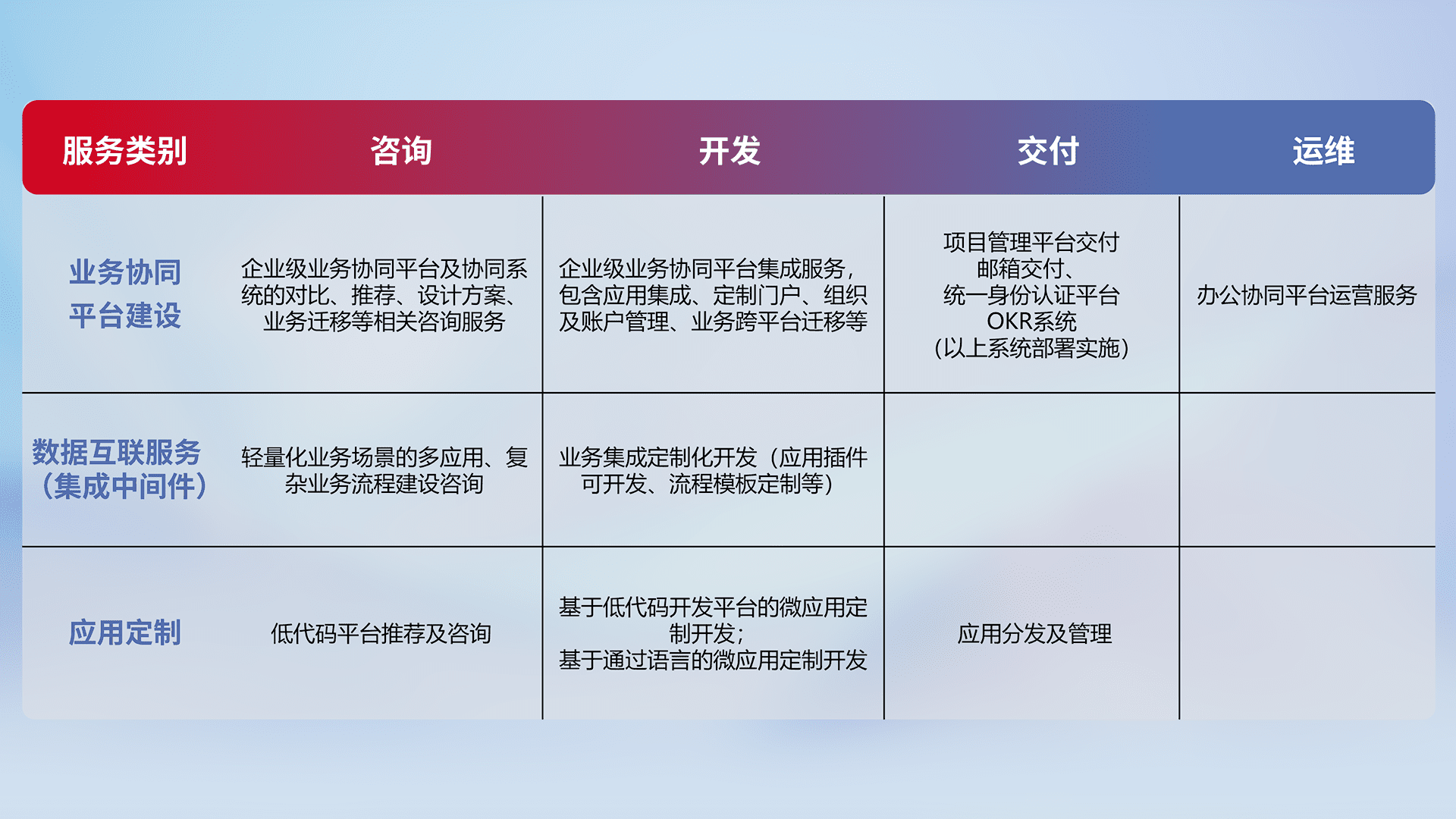 针对钉钉、、企微、、、、IDaas等平台级产品提供产品的规划、、、方案、、交付、、、定制化开发等服务,,,,实现如统一协同办公、、智能客户服务、、、混合会议管理、、智能数据查询、、等业务场景,,,实现数字化转型。。。。